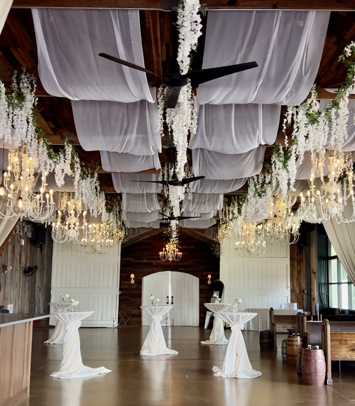 Transform the barn by adding our Barn Celieing Drapery & Greenery for a dreamy, floral moment!